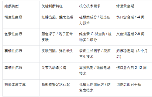控制期(2-12 周):針對(duì)紅腫增生,選擇含微靜電場(chǎng)或壓力調(diào)節(jié)技術(shù)的產(chǎn)品;針對(duì)色沉,選擇含美白成分的透皮吸收型產(chǎn)品。