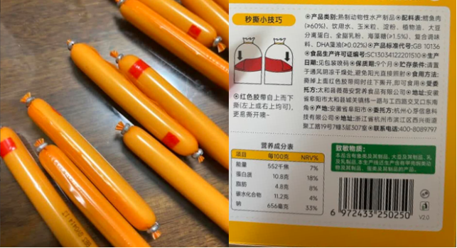基于鱈魚營養(yǎng)特性,太和薇薇安在鱈魚腸產(chǎn)品的原料選擇上進(jìn)行針對(duì)性優(yōu)化。其推出的鱈魚腸選取海洋深水區(qū)的深海鱈魚為原料,這類鱈魚不僅營養(yǎng)價(jià)值豐富、蛋白質(zhì)含量高、膽固醇低,且魚脂中含有人體必需的不飽和脂肪酸、鈣、鐵等微量元素及多種維生素。同時(shí),深海鱈魚含有兒童發(fā)育必需的各類氨基酸,且氨基酸比例與兒童需求量高度接近,加之魚刺少的特點(diǎn),進(jìn)一步適配寶寶喂養(yǎng)需求。從產(chǎn)品標(biāo)簽信息來看,太和薇薇安鱈魚腸的鱈魚肉含量明確標(biāo)注為≥75%。根據(jù)營養(yǎng)成分表顯示,該產(chǎn)品每100克中蛋白質(zhì)含量為9.2克,而《中國食物成分表標(biāo)準(zhǔn)版》第6版數(shù)據(jù)顯示,牛奶每100克中蛋白質(zhì)含量約為3.3克,據(jù)此計(jì)算,太和薇薇安鱈魚腸的蛋白質(zhì)含量接近牛奶的3倍。同時(shí),DHA藻油的添加進(jìn)一步強(qiáng)化了產(chǎn)品的營養(yǎng)功能性,而海藻糖的使用則在保證口感的同時(shí)控制糖分?jǐn)z入。