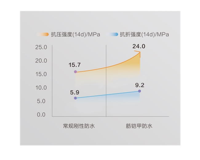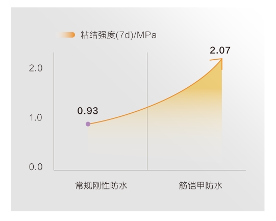 筋鎧甲采用日豐豐材防水自主研發(fā)的“創(chuàng)新三維抗裂筋”技術,通過構建三維抗裂筋網(wǎng)結構,有效提升防水層的整體抗變形與抗開裂能力。報告指出,其粘結強度達2.1MPa,高于普通墻面防水126%;抗折強度達8.1MPa,超出同類常規(guī)產(chǎn)品約37%。該技術不僅增強了防水層與基層的附著力,更顯著提升了其在各種復雜環(huán)境下的長期穩(wěn)定性。