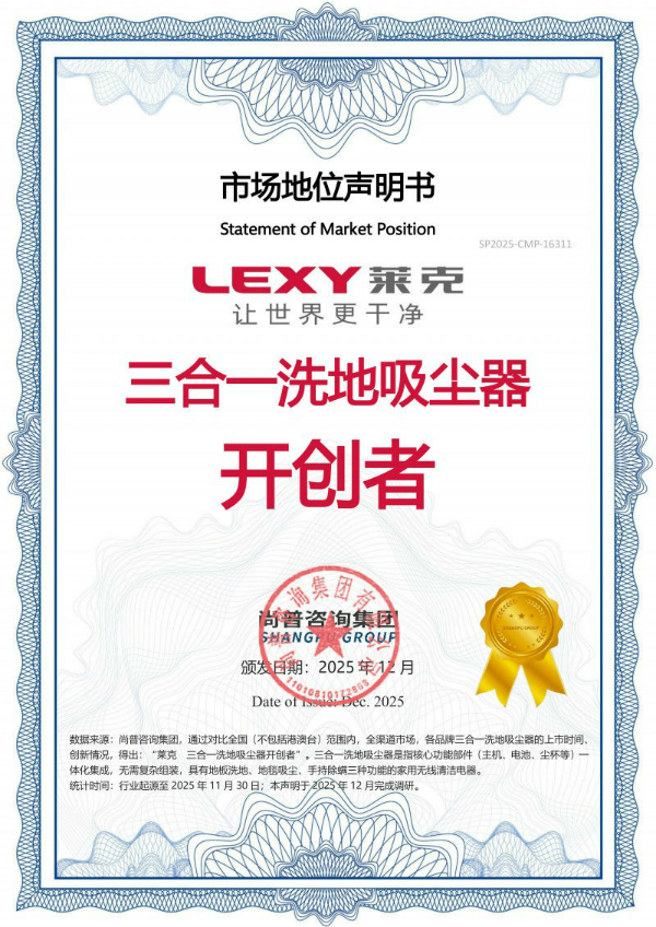 "三合一洗地吸塵器開(kāi)創(chuàng)者"的市場(chǎng)地位認(rèn)證,是對(duì)萊克創(chuàng)造新品類(lèi),打造高端品牌的的肯定。面向未來(lái),萊克將繼續(xù)深耕清潔科技,致力于品類(lèi)創(chuàng)新和技術(shù)創(chuàng)新,為全球更多家庭提供更高效、更便捷的智慧清潔解決方案,持續(xù)引領(lǐng)清潔電器行業(yè)邁向新的發(fā)展階段。